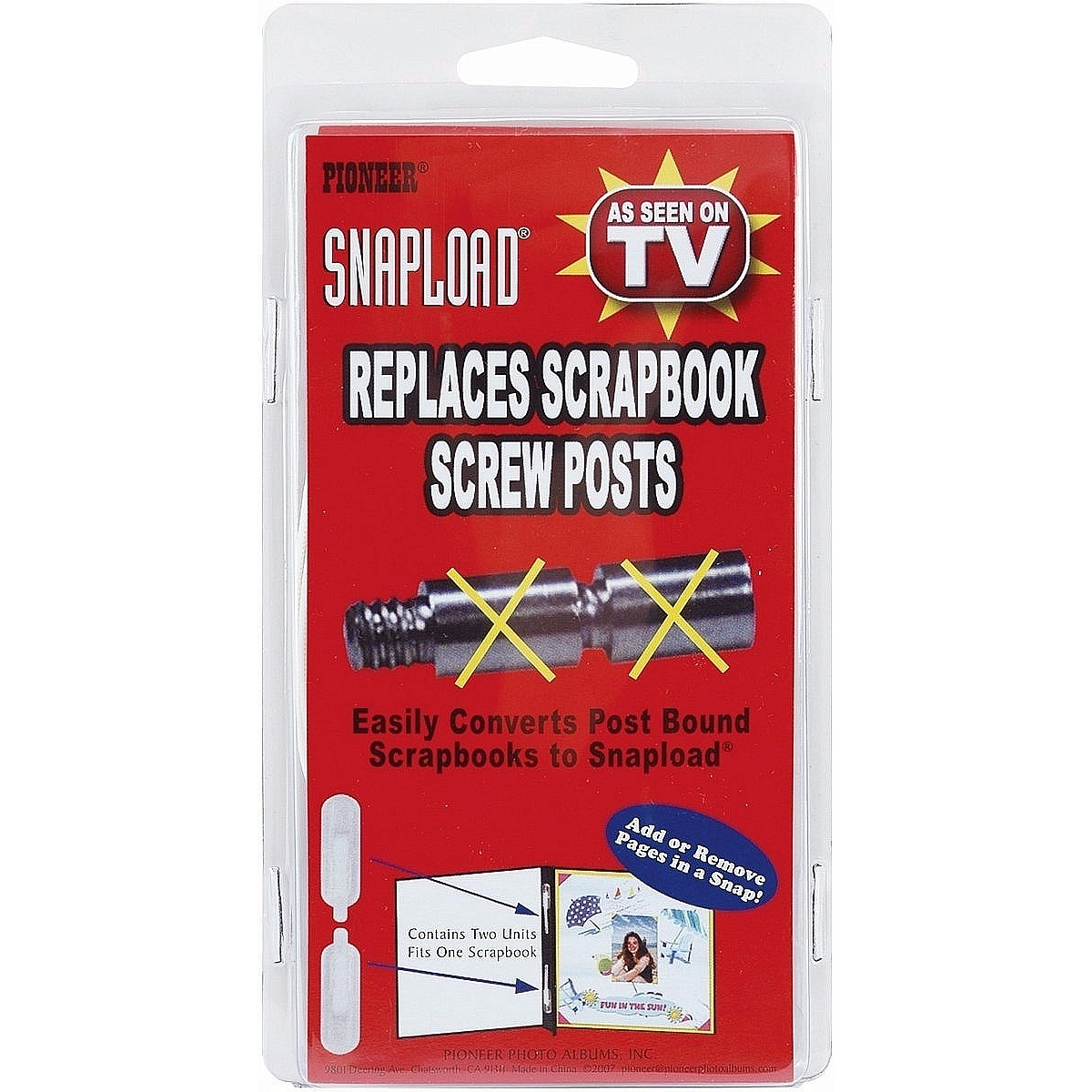 Product Details Pioneer Albums® The Original Pioneer® Screw Post SNAPLOAD Conversion Kit — The 2SL Pioneer Snapload Retrofit Kit converts post-bound scrapbooks and albums to a snapload mounting format. This set substitutes for your screw-posts, replacing them with a flexible binding design that allows you to rapidly swap pages. Includes installation instructions and hardware for converting a single scrapbook Each set holds up to 300 pages that will lay flat for quick loading and optimal viewing Kit is archival, acid-free and safe for long-term photo storage Package measures approximately 7-3/5" x 4" x 9/10" Made by Pioneer®, a genuine album replacement part.Note: We suggest purchasing SNAPLOAD packages as an "add-on" with purchase of album(s) on SendAFrame. The Original Pioneer® Screw Post SNAPLOAD Conversion Kit Model #023602617155 List $6.00 You pay $4.95 In stock Can be shipped today [?] Your Price Match is Active Your request for a price of $0.00 for a minimum quantity of has been accepted. You have [time] left to purchase this item for $0.00 instead of $4.95 each. Find a Lower Price? We BEAT All Authorized Retailers [?] FEATURESMaterial:Metallic (all)Occasion:Business & office, Craft ProjectsStyle:Brand:Pioneer Albums®Display Type:not applicable n/a Approx. Overall Dimensions:4"x9 3/8"x7/8" SHARE THIS ITEM Share on Facebook
