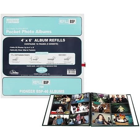 Main view Product Details Pioneer Albums® Genuine Pioneer® 12-at-a-time 4x6 pocket refills w/black background — 12-at-a-time refills for your post-bound albums. 5 sheets per pack - holds 60 4x6 photos Optically clear pockets Side loading from center of album Black mesh page background 2 holes spaced 7-1/4" apart Includes extension posts for the Pioneer BSP-46 photo albums Pioneer albums and accessories are acid free, archival, and photo-safe Produced and certified by Pioneer®, makers of albums for generations. Genuine Pioneer® 12-at-a-time 4x6 pocket refills w/black background Model #023602405141 List $8.50 You pay $5.95 In stock Can be shipped today [?] Your Price Match is Active Your request for a price of $0.00 for a minimum quantity of has been accepted. You have [time] left to purchase this item for $0.00 instead of $5.95 each. Find a Lower Price? We BEAT All Authorized Retailers [?] FEATURESDisplays:4"x6"Material:Archival | Photo-SafeFinish:Black, ClearStyle:Orientation:Horizontal OnlyBrand:Pioneer Albums®Display Type:not applicable n/a Approx. Overall Dimensions:13 1/4"x14" SHARE THIS ITEM Share on Facebook
