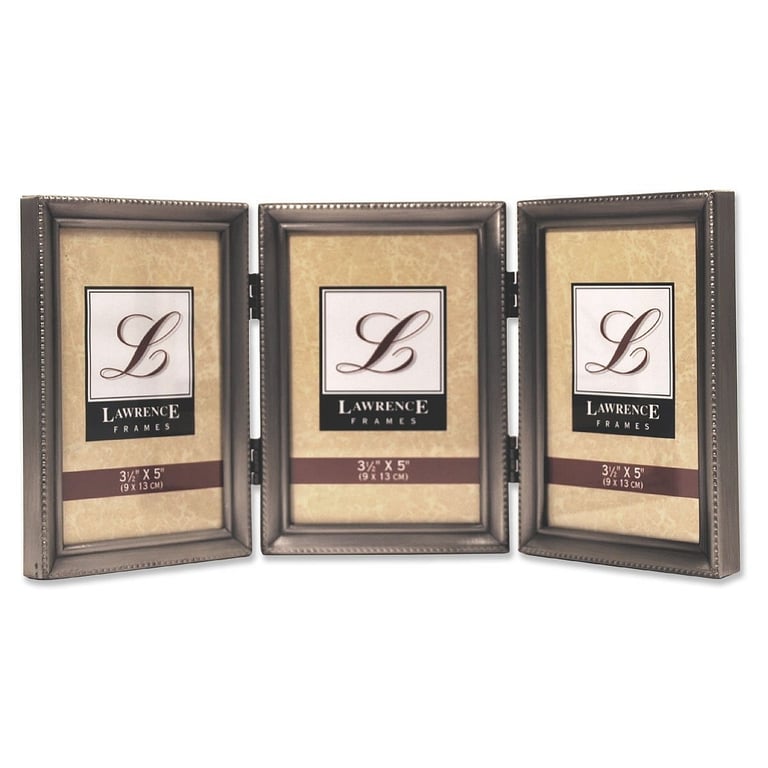 Main view Product Details Lawrence Frames® Satin antiqued pewter hinged 3½x5 triple w/caviar bead trim — Hard-to-find, an antiqued pewter frame caviar bead accent. Niicely crafted with invisible seams and corners. Nicely backed for wonderful desk appeal. Glare resistant glass lenses. Edge measures 3/8" wide all around. A clean, crisp way to enjoy three 3½"x5" photos. Wall mounts included for easy hanging.By Lawrence®. Click the Lawrence Frame collection to shop the entire line. Satin antiqued pewter hinged 3½x5 triple w/caviar bead trim Lawrence® HOLIDAY CELEBRATION Savings: Buy More / Save More * Add this item to your cart for the full details of this promotion. Conditions may apply. Model #751148035101 List $40.00 You pay $27.95 In stock Can be shipped today [?] Your Price Match is Active Your request for a price of $0.00 for a minimum quantity of has been accepted. You have [time] left to purchase this item for $0.00 instead of $27.95 each. Find a Lower Price? We BEAT All Authorized Retailers [?] FEATURESDisplays:3.50"x5"Material:Pewter (plate)Finish:SilverOccasion:Anniversary, Birthday, Good luck, Grandparent`s Day, Mother`s Day, Retirement, Teacher gifts, Thank-Motivate-Reward, Celebrating Travels, WeddingStyle:Antique, Classic, TraditionalOrientation:Vertical OnlyBrand:Lawrence Frames®Display Type:Desktop or Wall This item ships in its own box SHARE THIS ITEM Share on Facebook