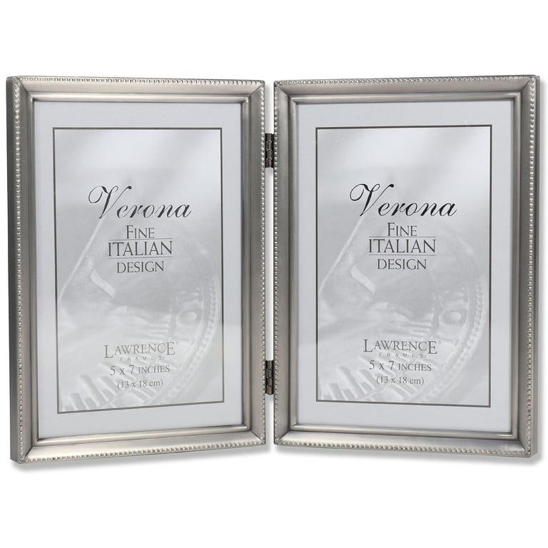Main view Product Details Lawrence Frames® Satin antiqued pewter hinged double 5x7 frame w/caviar bead trim — Antiqued pewter frame with beaded detail is beautifully crafted with invisible seams and corners.Attractively backed for wonderful desk appeal. Glare resistant glass lenses.Edge measures 3/8" wide all around.By Lawrence®. Click the Lawrence Frame collection to shop the entire line. Satin antiqued pewter hinged double 5x7 frame w/caviar bead trim Lawrence® HOLIDAY CELEBRATION Savings: Buy More / Save More * Add this item to your cart for the full details of this promotion. Conditions may apply. Model #751148035071 List $40.00 You pay $30.95 In stock Can be shipped today [?] Your Price Match is Active Your request for a price of $0.00 for a minimum quantity of has been accepted. You have [time] left to purchase this item for $0.00 instead of $30.95 each. Find a Lower Price? We BEAT All Authorized Retailers [?] FEATURESDisplays:5"x7"Material:Pewter (plate)Finish:SilverOccasion:Anniversary, Good luck, Mother`s Day, Retirement, Romantic, Teacher gifts, Thank-Motivate-Reward, Celebrating Travels, Wedding, BirthdayStyle:Antique, Classic, Traditional, RomanticOrientation:Vertical OnlyBrand:Lawrence Frames®Display Type:Desktop or Wall This item ships in its own box SHARE THIS ITEM Share on Facebook