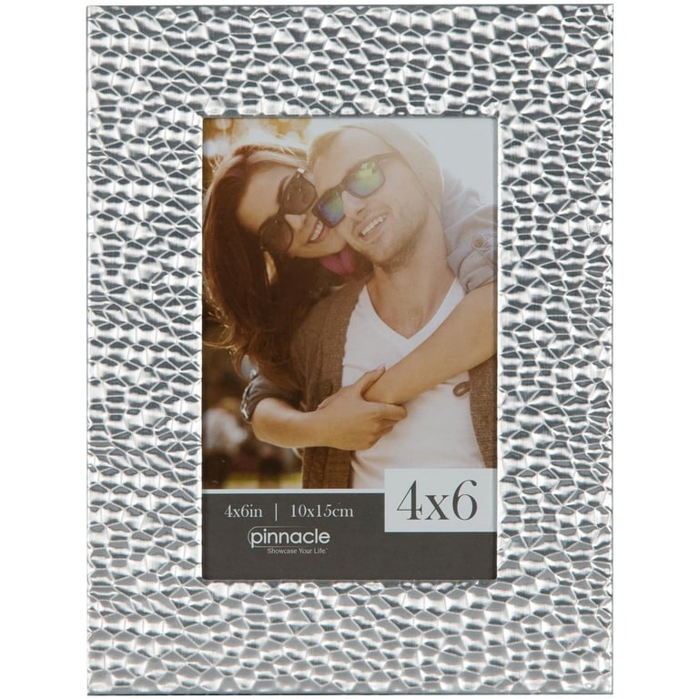 Product Details Pinnacle Hammered Silver finish 4x6 frame by Pinnacle® — Crafted in an embossed silver with a pebble texture of hammered metal, this style frame is an excellent piece to show your photo in a unique setting. Features a velvet two-way easel back for vertical or horizontal table-top display. Or, use the included hooks for easy wall mounting. Glare resistant glass lens. By Pinnacle®. Hammered Silver finish 4x6 frame by Pinnacle® Model #038555485195 $8.49 only 1 left, order soon. This item IS in stock and can be expected to ship 01/21/2026 In stock Your Price Match is Active Your request for a price of $0.00 for a minimum quantity of has been accepted. You have [time] left to purchase this item for $0.00 instead of $8.49 each. Find a Lower Price? We BEAT All Authorized Retailers [?] FEATURESDisplays:4"x6"Material:Metallic (all)Finish:SilverOccasion:Birthday, Business & office, Friendship, Home decorating, Thank-Motivate-RewardStyle:Contemporary, SophisticatedOrientation:BothBrand:PinnacleDisplay Type:Desktop or Wall Approx. Overall Dimensions:6 5/16"x8 5/16"x5/8" This item ships in its own box SHARE THIS ITEM Share on Facebook