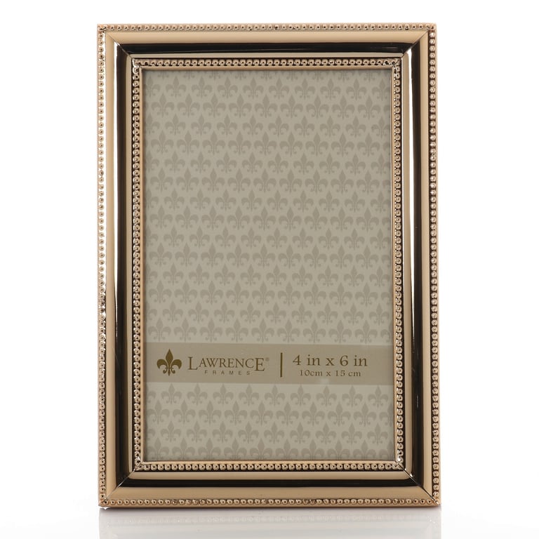 Main view Product Details Lawrence Frames® Gold Bead 4x6 frame — Classic, beautifully crafted metallic frame. Frame features an elegant "caviar" beaded trim border. Features a double bead inner/outer trim accent. Features glare resistant glass lens and hardboard backing. By Lawrence Frames®, crafting fine frames for generations. Gold Bead 4x6 frame Lawrence® HOLIDAY CELEBRATION Savings: Buy More / Save More * Add this item to your cart for the full details of this promotion. Conditions may apply. Model #751148051330 List $22.50 You pay $15.95 In stock Can be shipped today [?] Your Price Match is Active Your request for a price of $0.00 for a minimum quantity of has been accepted. You have [time] left to purchase this item for $0.00 instead of $15.95 each. Find a Lower Price? We BEAT All Authorized Retailers [?] FEATURESDisplays:4"x6"Material:Gold plateFinish:GoldOccasion:Business & office, Celebrating Travels, Friendship, Home decoratingStyle:Classic, Contemporary, Sophisticated, TraditionalOrientation:BothBrand:Lawrence Frames®Display Type:Desktop or Wall Approx. Overall Dimensions:5"x7"x5/8" This item ships in its own box SHARE THIS ITEM Share on Facebook