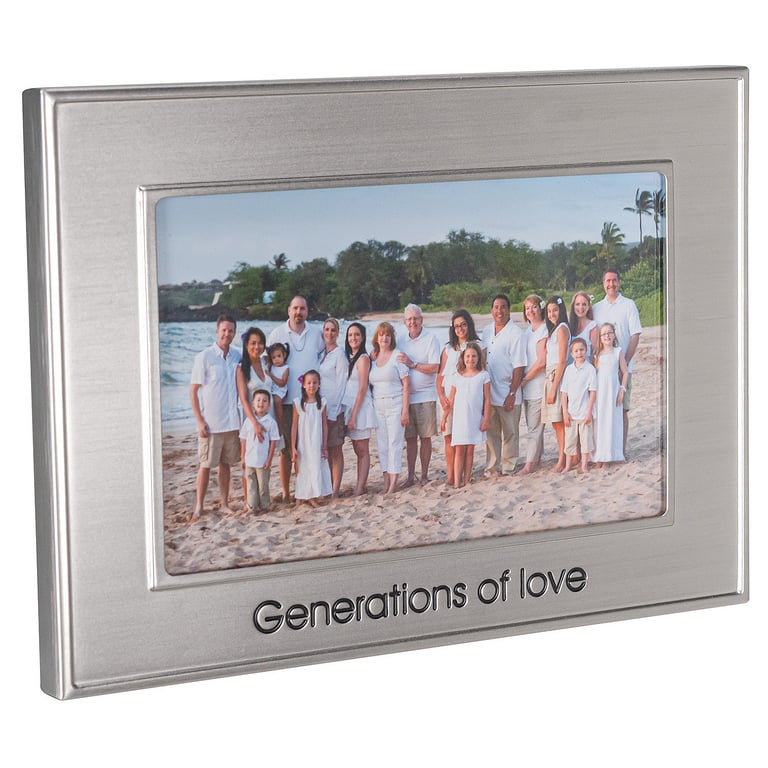 Main view Product Details Malden Designs® GENERATIONS OF LOVE METALLIC Brushed-Silver 6x4 frame — Modern brushed silver frame, add a great photo and you have a gift that will make the family smile!Fashioned in stamped metallic silver. Displays a 6"x4" photo. Glass lens. Slide-in channel back. Personalizing available; click PERSONALIZE THIS ITEM. By Malden International Designs®. GENERATIONS OF LOVE METALLIC Brushed-Silver 6x4 frame Model #096287157285 List $17.00 You pay $13.95 This item can be expected to ship by 02/19/2026. Order now by clicking ADD TO CART (below); you are only charged when we actually ship. Or, Click here to be automatically notified when it comes back in stock. Your Price Match is Active Your request for a price of $0.00 for a minimum quantity of has been accepted. You have [time] left to purchase this item for $0.00 instead of $13.95 each. Find a Lower Price? We BEAT All Authorized Retailers [?] FEATURESDisplays:4"x6"Material:Pewter (plate)Finish:Gray/Charcoal, SilverOccasion:Hanukkah, Christmas, Grandparent`s DayStyle:Words & whimsy, Sentiments | ready madeOrientation:Horizontal OnlyBrand:Malden Designs®Display Type:Desktop or Wall This item ships in its own box SHARE THIS ITEM Share on Facebook