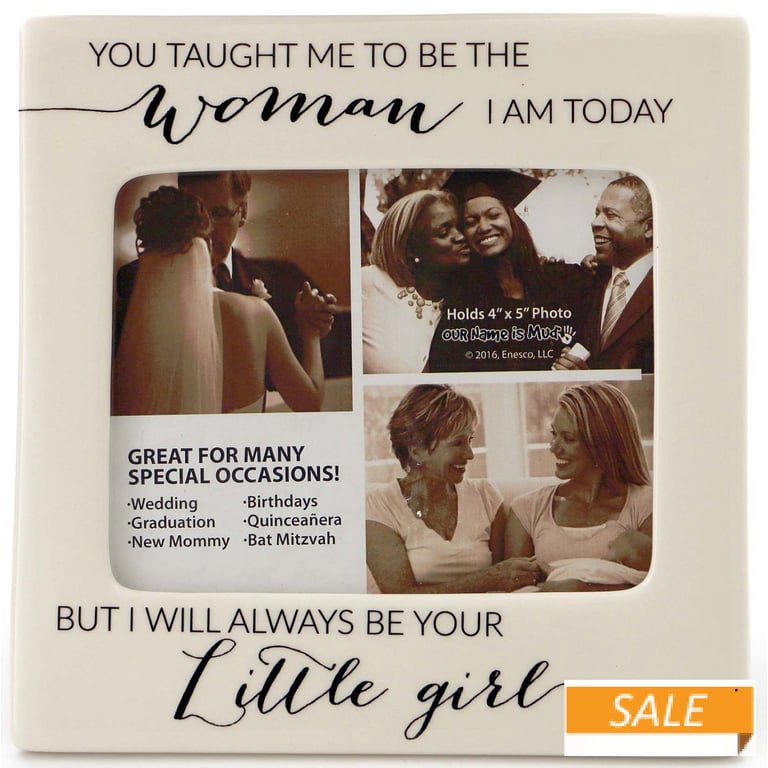 Main view Reverse Product Details Enesco I WILL ALWAYS BE YOUR LITTLE GIRL frame by Our Name is Mud® — You TAUGHT ME TO BE THE WOMAN I AM TODAY BUT I WILL ALWAYS BE YOUR LITTLE GIRL An adorable ceramic photo frame, this may be the the perfect wedding gift for a brides mother or father. It holds a 5" x 4" photo and is giftboxed. Glare resistant glass lens. Easel back for horizontal tabletop display. Designed by Lorrie Veasey for Our Name is Mud. Great wedding engagement or anniversary gift. Hand crafted by Our Name is Mud®. I WILL ALWAYS BE YOUR LITTLE GIRL frame by Our Name is Mud® Model #045544915915 List $14.95 You pay $7.19 In stock Can be shipped today [?] Your Price Match is Active Your request for a price of $0.00 for a minimum quantity of has been accepted. You have [time] left to purchase this item for $0.00 instead of $7.19 each. Find a Lower Price? We BEAT All Authorized Retailers [?] FEATURESDisplays:4"x5"Material:CeramicFinish:Ivory/CreamOccasion:Birthday, Inspirational, Mother`s Day, Sweet 16, Valentine`s Day, Wedding, Father`s DayStyle:Contemporary, Words & whimsy, Sentiments | ready made, Unique | LimitedOrientation:Horizontal OnlyBrand:EnescoDisplay Type:Tabletop (or wall w/optional hanger - available separately) This item ships in its own box SHARE THIS ITEM Share on Facebook