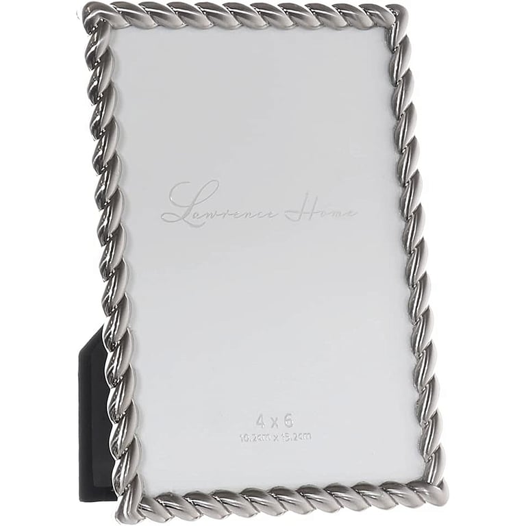 Main view Product Details Lawrence Frames® BRUSHED NICKEL ROPE 4x6 frame — A simple and elegant impressive silver frame with rope silhouette. Wonderful desk appeal; or use the wall mounts for easy hanging. Glare resistant glass lens.By Lawrence®, fine frames for generations. BRUSHED NICKEL ROPE 4x6 frame Model #751148085601 List $26.50 You pay $21.95 This item IS in stock and can be expected to ship 01/19/2026 Your Price Match is Active Your request for a price of $0.00 for a minimum quantity of has been accepted. You have [time] left to purchase this item for $0.00 instead of $21.95 each. Find a Lower Price? We BEAT All Authorized Retailers [?] FEATURESDisplays:4"x6"Material:SilverplateFinish:SilverOccasion:Anniversary, Birthday, Business & office, Home decorating, WeddingStyle:Classic, Contemporary, TraditionalOrientation:BothBrand:Lawrence Frames®Display Type:Desktop or Wall This item ships in its own box SHARE THIS ITEM Share on Facebook