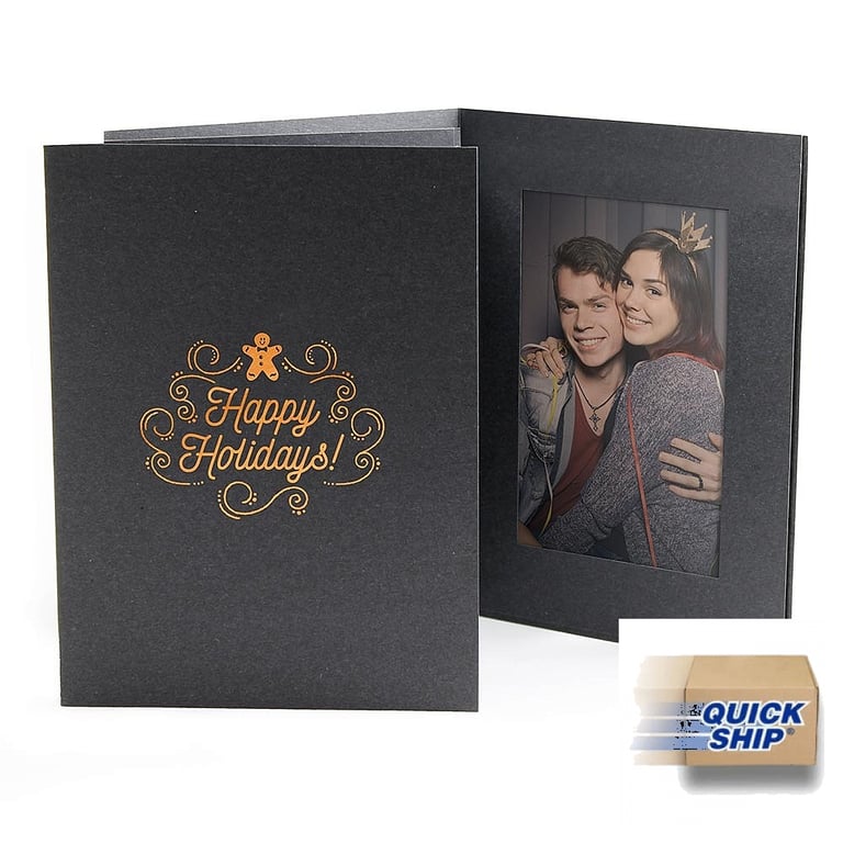 Our photo folder in black, accented with Gingerbread Man - Happy Holidays! in metallic foil. Design is hot stamped (imprinted) onto the front of the folder as shown.