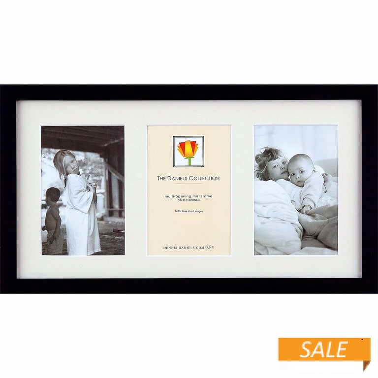 Main view Product Details Dennis Daniels® GALLERY WOODS ebony-black 4x6 triple collage w/soft-white mat by Dennis Daniels® — Dennis Daniels' classic wood frame with removable mat holds three 4"x6" photos.You will love the richness of the stain color and grain.Piece comes complete with recessed anodized wall hooks for easy wall mounting. Easel back for tabletop display too.The acid-free mat will provide years of security for your prints. Glare resistant picture frame glass lens. Moulding edge is ¾". Overall, the frame measures 9" x 16½". Crafted by Dennis Daniels® of California, the beautiful frame people. GALLERY WOODS ebony-black 4x6 triple collage w/soft-white mat by Dennis Daniels® Dennis Daniels® HOLIDAY CELEBRATION Savings - ends Sunday: Buy More / Save More * Add this item to your cart for the full details of this promotion. Conditions may apply. Model #782680009480 List $34.50 You pay $19.90 In stock Can be shipped today [?] Your Price Match is Active Your request for a price of $0.00 for a minimum quantity of has been accepted. You have [time] left to purchase this item for $0.00 instead of $19.90 each. Find a Lower Price? We BEAT All Authorized Retailers [?] FEATURESDisplays:4"x6"Material:Wood (full grain)Finish:BlackOccasion:Business & office, Home decorating, Inspirational, Thank-Motivate-Reward, Celebrating Travels, Corporate giftsStyle:Classic, Minimal, Contemporary, TraditionalOrientation:BothBrand:Dennis Daniels®Display Type:Desktop or Wall Approx. Overall Dimensions:16 1/4"x9"x1/2" This item ships in its own box SHARE THIS ITEM Share on Facebook